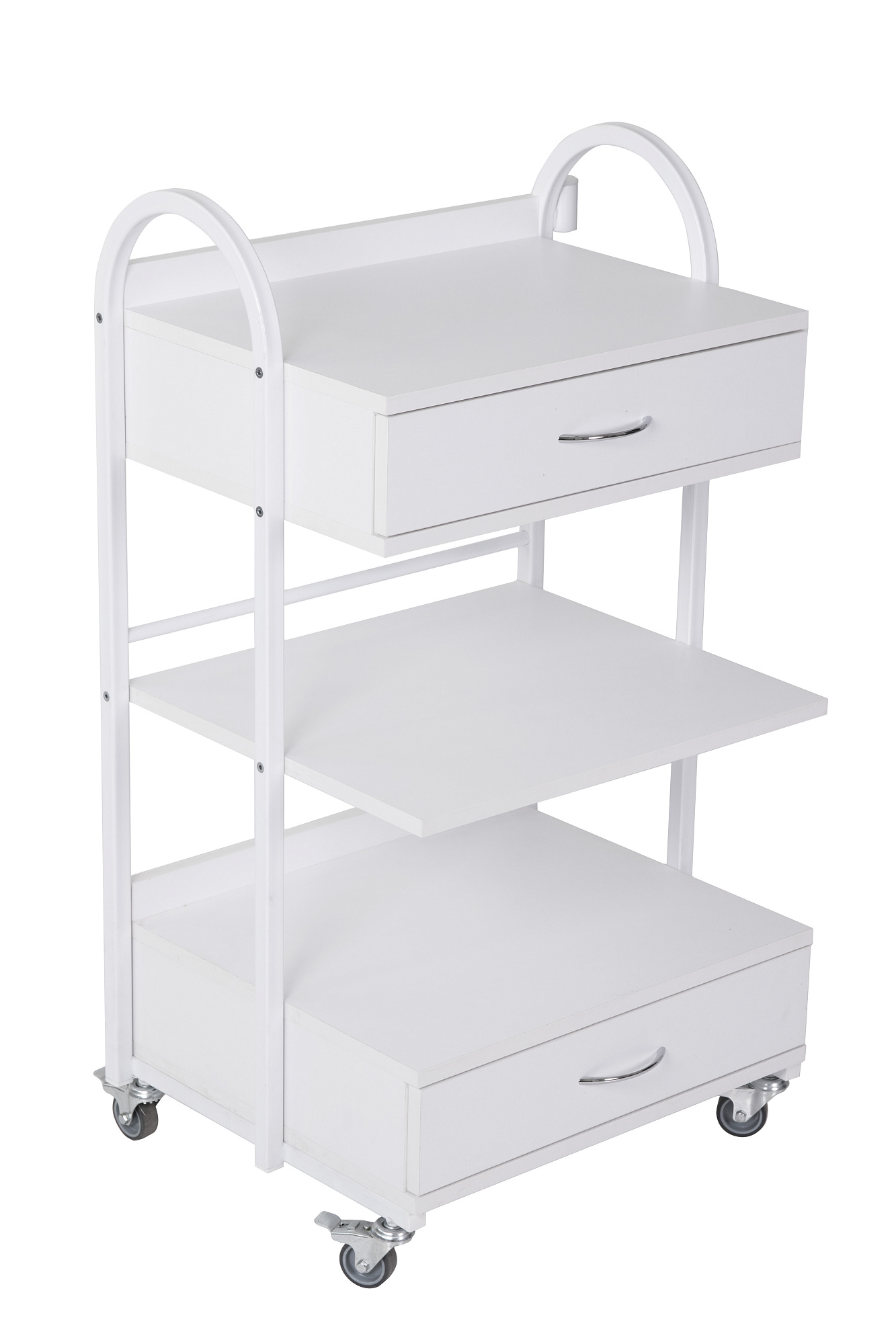 Столик для профессионального использования на металлическом каркасе белого цвета с одной полкой из ЛДСП, двумя выдвижными ящиками и специальным креплением для лампы-лупы.