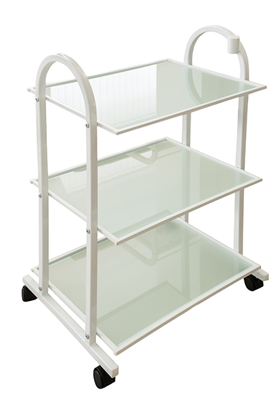 Столик для профессионального использования на металлическом каркасе белого цвета с тремя полками из стекла и отверстием для лампы-лупы.
