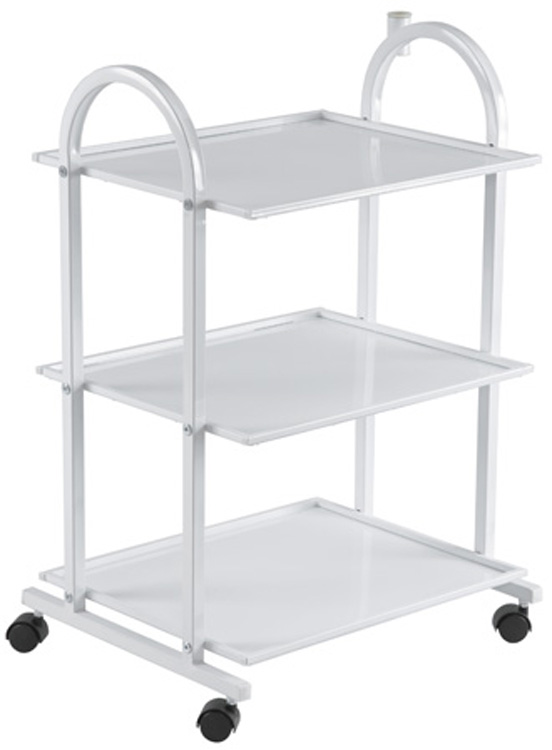 Столик для профессионального использования на металлическом каркасе белого цвета с тремя металлическими полками и отверстием для лампы-лупы.