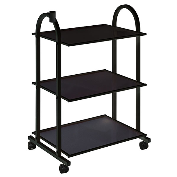 Столик для профессионального использования на металлическом каркасе черного цвета с тремя металлическими полками и отверстием для лампы-лупы.
