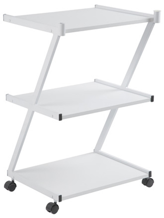 Столик для профессионального использования на металлическом каркасе белого цвета с тремя полками из ламинированного ДСП и отверстием для лампы-лупы.