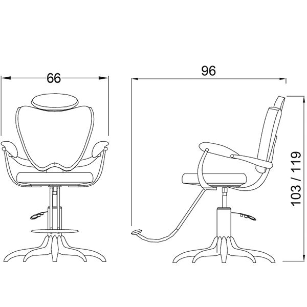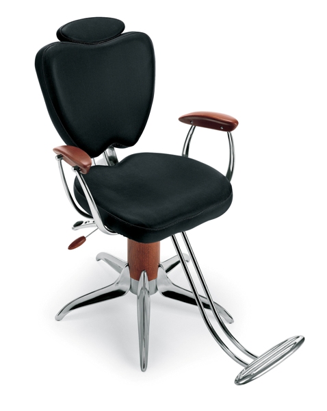 Дизайнерское парикмахерское кресло. Кресло для клиента комплектуется металлическим хромированным основанием в форме пятилучья с декоративной деревянной накладкой (возможно изготовление в любом цвете дерева, а также в черном матовом лаке). Также кресло комплектуется гидроподъемником с блокировкой. Кресло оснащено регулируемыми спинкой и подголовником, а также подножкой и комфортными алюминиевыми подлокотниками с накладками из дерева. Обивка - искусственная кожа высшего качества.
