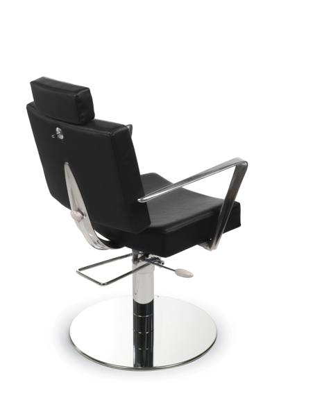 Кресло для клиента комплектуется дисковым основанием из нержавеющей стали и гидроподъемником с блокировкой. Кресло оснащено регулируемой спинкой и подголовником, а также металлическими подлокотниками. Обивка - искусственная кожа высшего качества.
