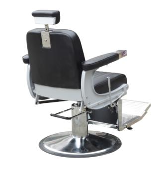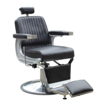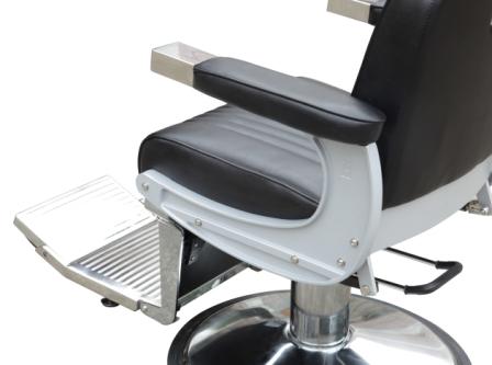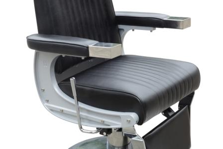 Классическое барбер-кресло c удобными мягкими подлокотниками с металлическими наконечниками и широкой спинкой.