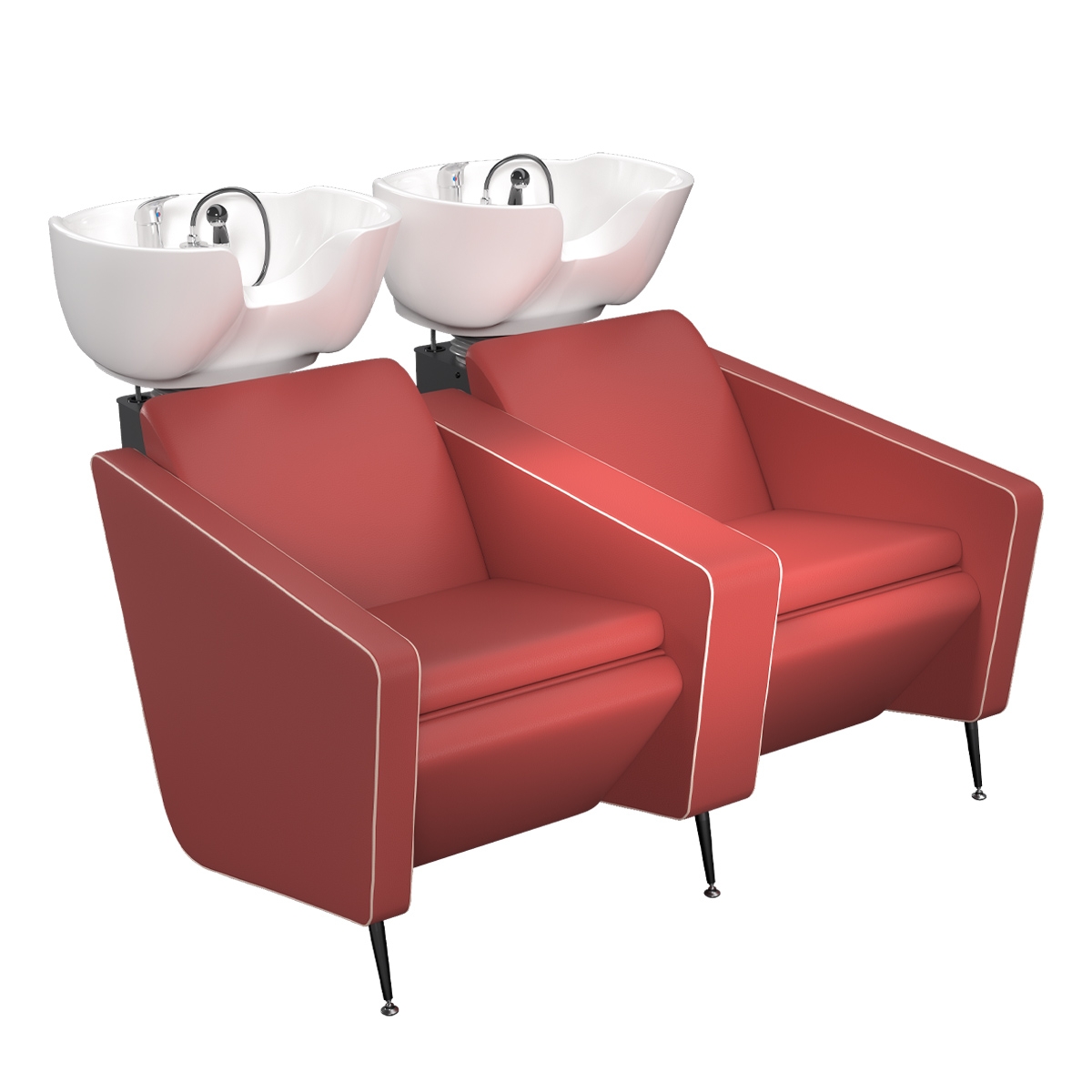 Мойка парикмахерская - двухместная. Мойка оснащена металлическим каркасом черного цвета, мягкими и комфортными подлокотниками, ножками из полированного алюминия. Мойка комплектуется глубокими керамическими раковинами с регулировкой угла наклона и комплектом смесителя. Обивка - искусственная кожа высшего качества.