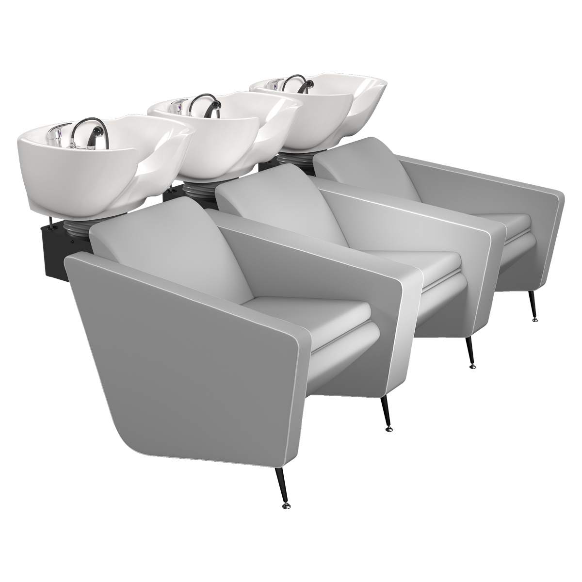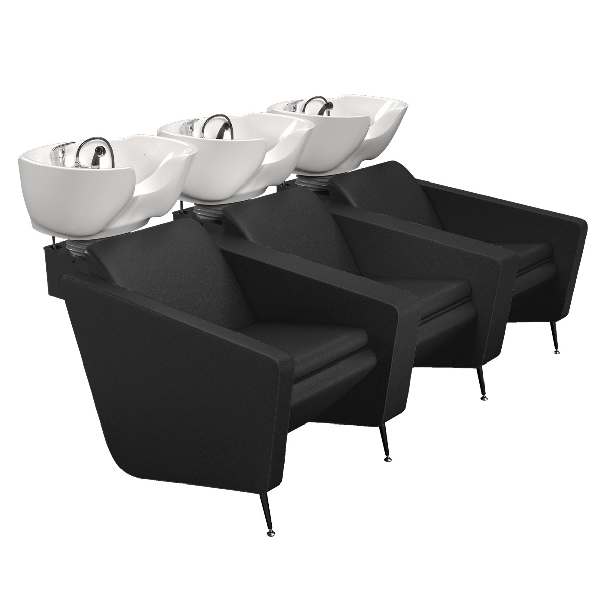 Мойка парикмахерская - трехместная. Мойка оснащена металлическим каркасом черного цвета, мягкими и комфортными подлокотниками, ножками из полированного алюминия. Мойка комплектуется глубокими керамическими раковинами с регулировкой угла наклона и комплектом смесителя. Обивка - искусственная кожа высшего качества.
