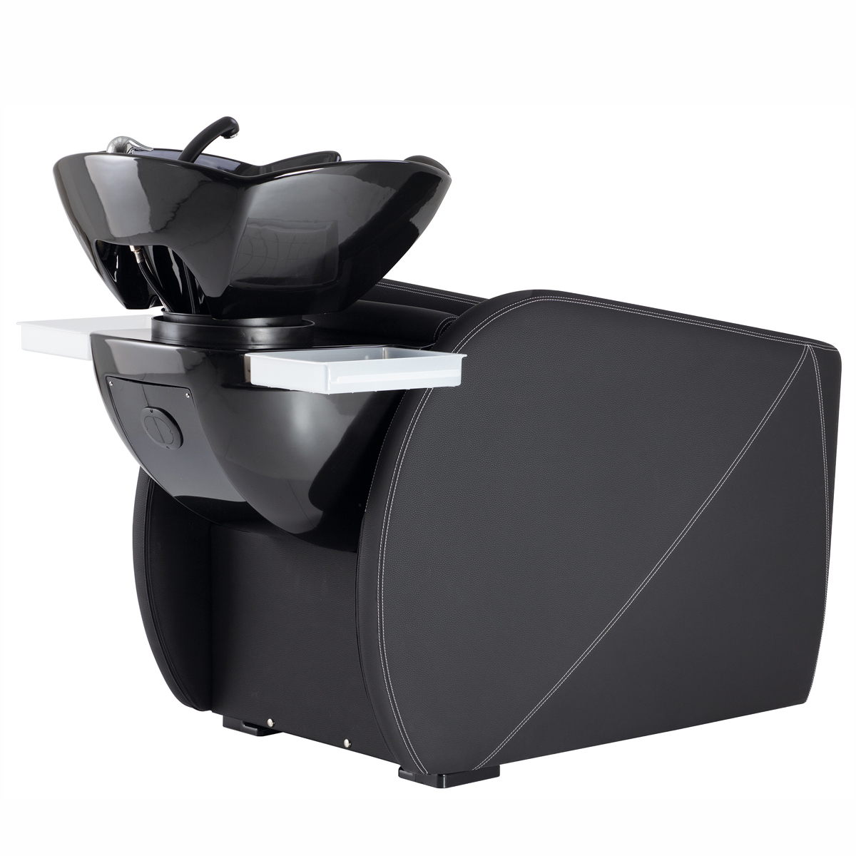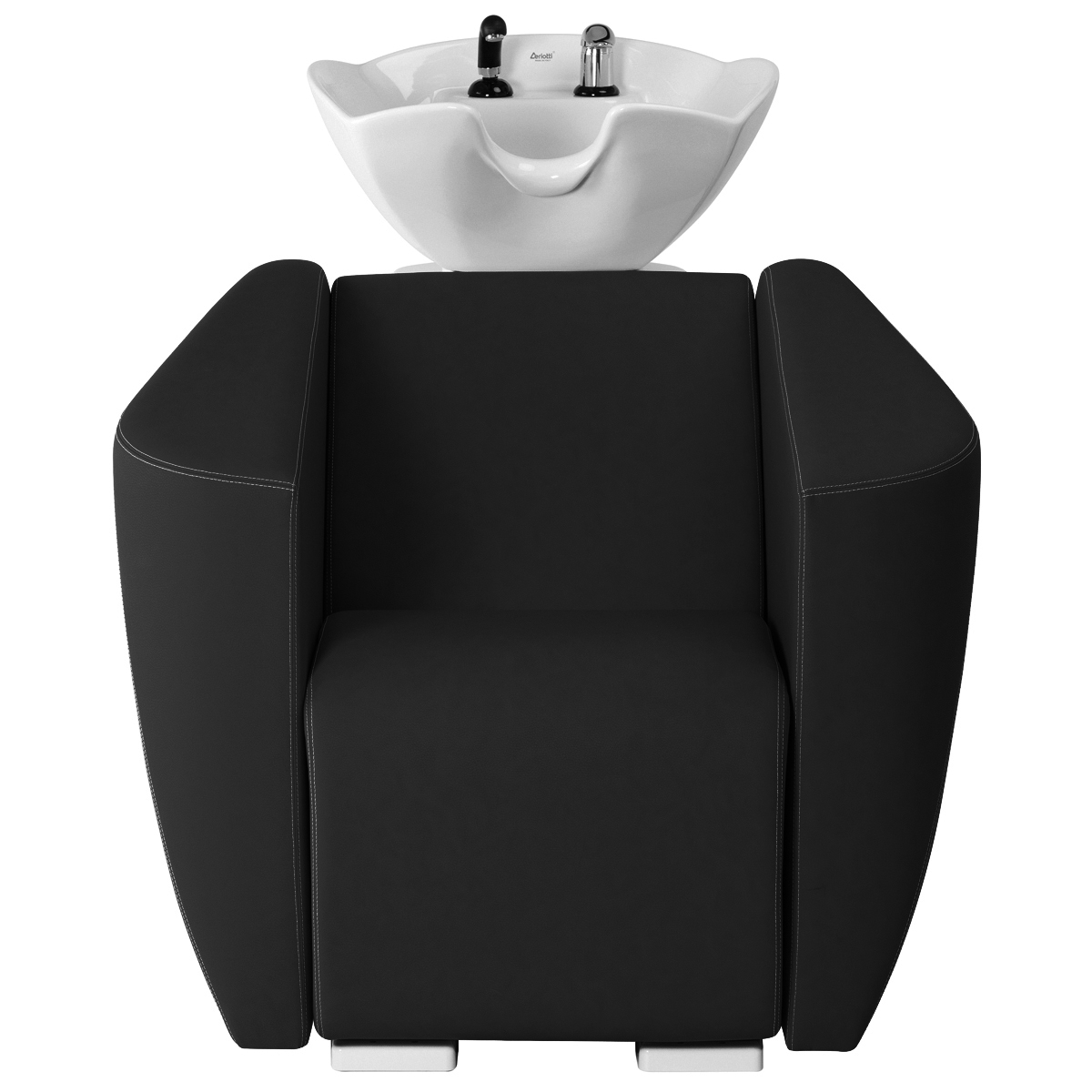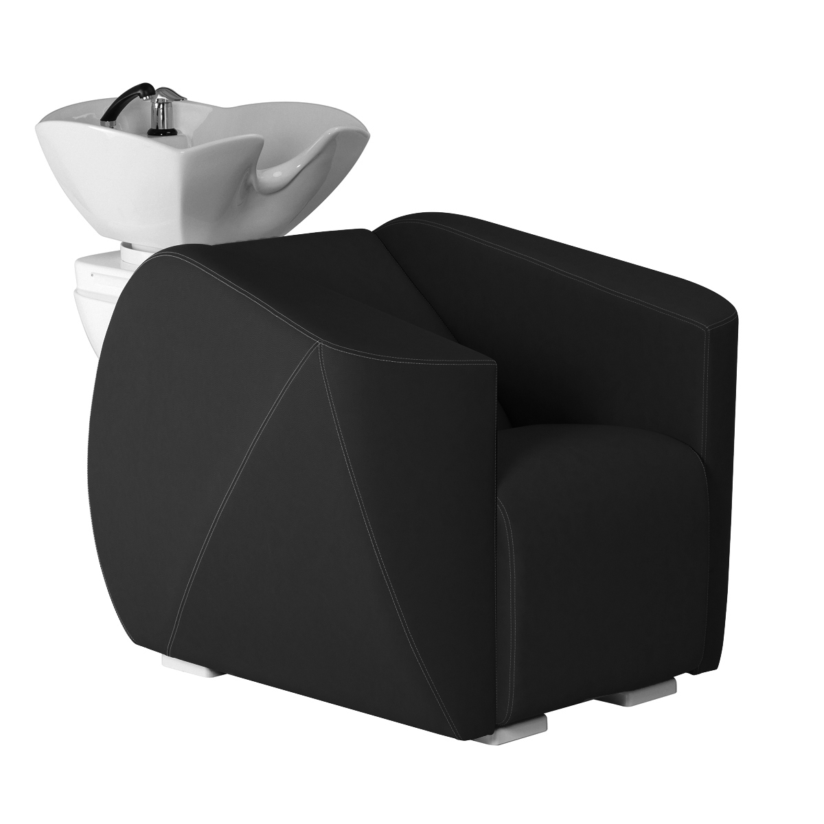 Мойка парикмахерская оригинальной формы. Каркас, сиденье и спинка выполнены из высококачественного вспененного полиуретана с вставками из дерева и металла. Кресло оснащено мягкими и комфортными подлокотниками. Мойка оснащена боковыми навесными полками для хранения инструментов. Мойка комплектуется глубокой керамической раковиной с регулировкой угла наклона и комплектом смесителя. Обивка - искусственная кожа высшего качества.