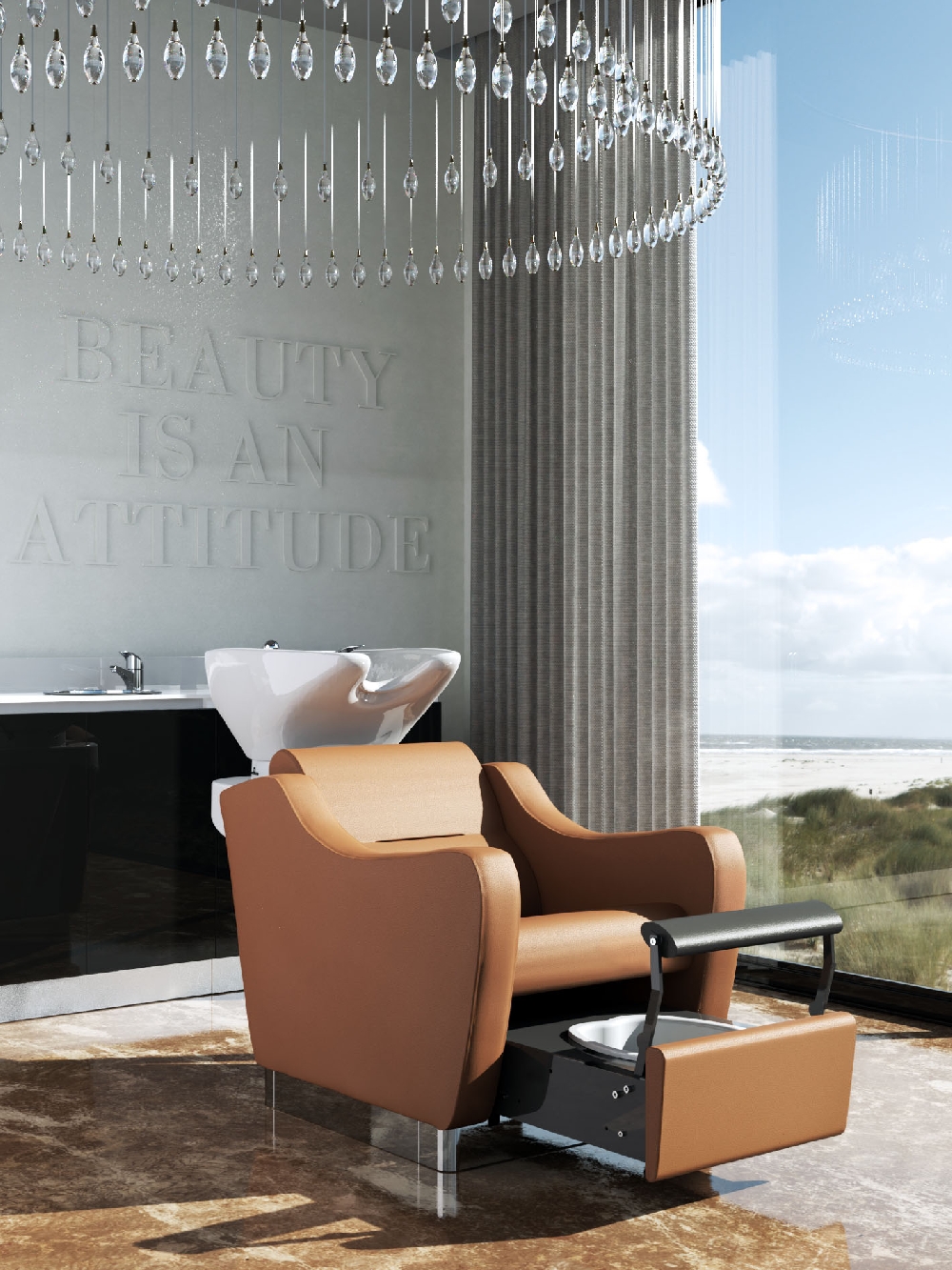 Элегантная мойка с высоким уровнем комфорта. В конструкции мойки - плавные линии, что придает данной модели элегантность и лаконичность. Каркас мойки выполнен из высококачественного полиуретана. Кресло оснащено мягкими и комфортными подлокотниками. Обивка - искусственная кожа высшего качества. Мойка комплектуется глубокой керамической раковиной с регулировкой угла наклона и комплектом смесителя с DROP-STOP "каплезащитным" душем в хромированном цвете.