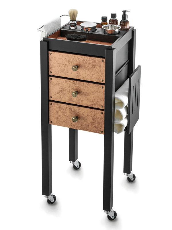 Дизайнерская тележка для профессионалов Barbershop. Тележка парикмахерская выполнена из дерева, фасады выдвижных ящиков и верхний лоток для инструментов покрыты медью. Тележка оснащена вращающимися прорезиненными колесами, тремя выдвижными ящиками, стальным держателем для полотенец, а также функциональной столешницей с отделениями под сопутствующие аксессуары.