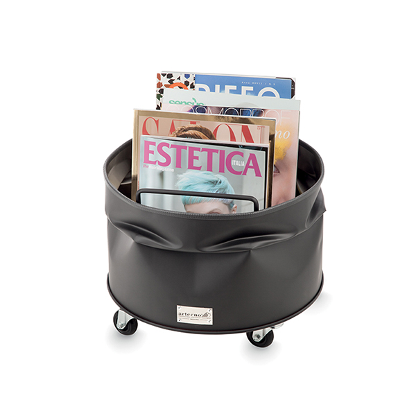 Оригинальная тележка из окрашенной стали идеально подходит для хранения журналов.