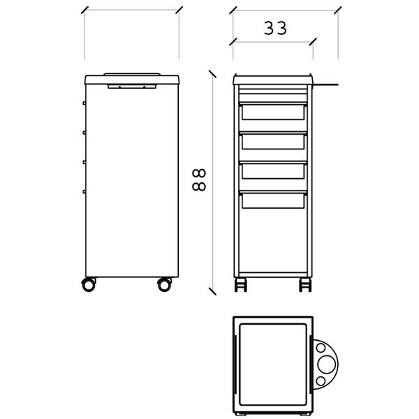 Тележка парикмахерская, выполнена из ламината матового черного цвета. Тележка оснащена выдвижными ящиками, фенодержателем и прорезинеными колесиками.