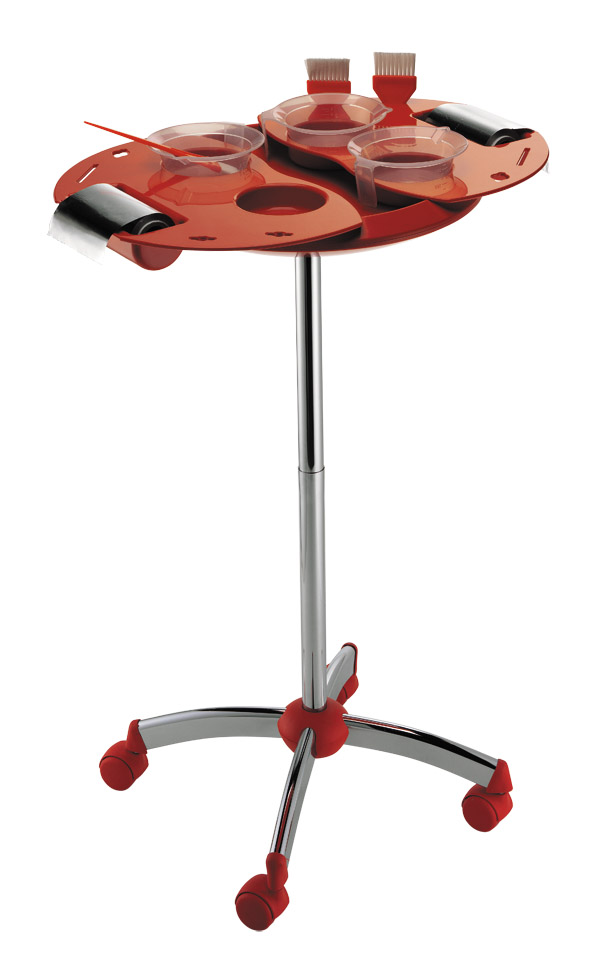 Тележка из пластика на колесах. Имеет 2 съёмных лотка, каждый из котрых оснащён двумя отделениями под миски для окрашивания, отделением с держателем для фольги и боковыми отверстиями для кистей и шпателей.