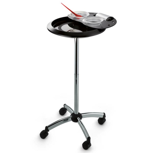 Тележка из пластика на колесах. Оснащена двумя отделениями под миски для окрашивания, держателем для фольги и боковыми отверстиями для кистей и шпателя.