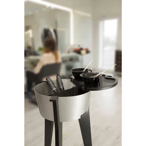 Тележка для окрашивания ICON сочетает в себе натуральные материалы - дерево и металл. Тележка оснащена колесами для удобства перемещения. Верхняя часть оснащена отсеком для хранения инструментов и откидной столешницей, предназначенной для размещения мисок для окрашивания. Тележка ICON сочетает в себе дизайн и функциональность.