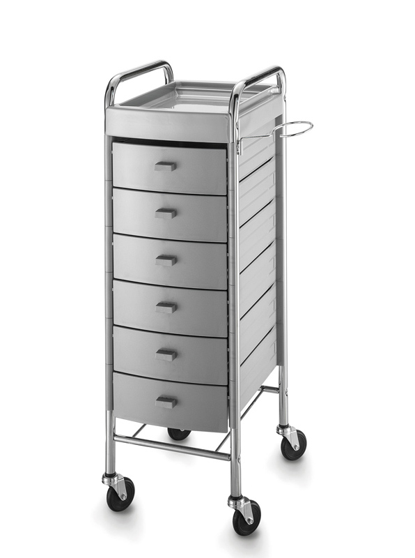 Тележка парикмахерская закрытого типа на хромированном каркасе из прочного пластика с шестью выдвижными ящиками. Оснащена прорезиненными колесами для комфортного и бесшумного перемещения и металлическим фенодержателем.