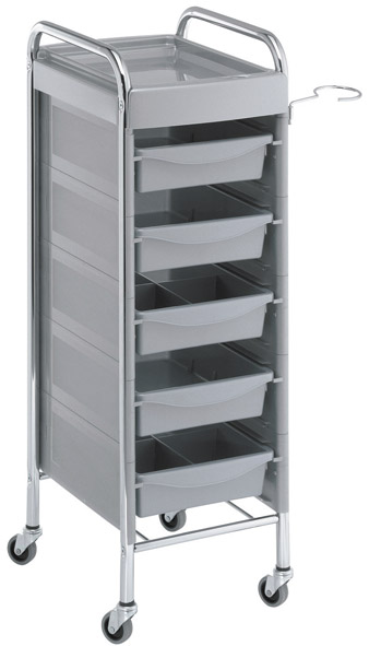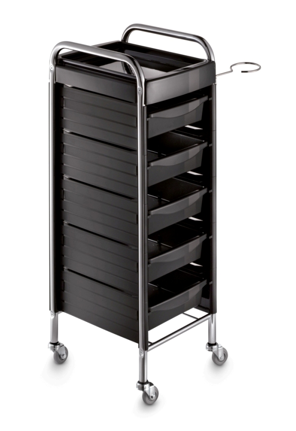 Тележка парикмахерская на хромированном каркасе из прочного пластика с пятью выдвижными ящиками. Оснащена прорезиненными колесами для комфортного и бесшумного перемещения и металлическим фенодержателем.
