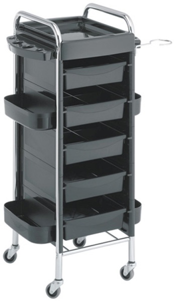 Тележка парикмахерская на хромированном каркасе из прочного пластика с пятью выдвижными ящиками. Оснащена прорезиненными колесами для комфортного и бесшумного перемещения, металлическим фенодержателем, боковыми полками с отделениями для сопутствующих аксессуаров, а также четырьмя съёмными лотками, которые регулируются по высоте.