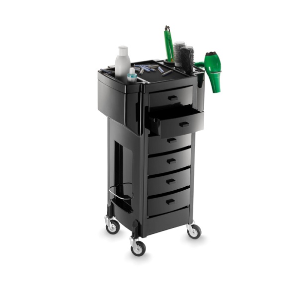 Тележка парикмахерская из прочного пластика закрытого типа. Оснащена прорезиненными колесами для комфортного и бесшумного перемещения, а также боковыми лотками с отделениями под шампуни и сопутствующие аксессуары. Имеет металлический фенодержатель. На боковых частях тележки расположены отсеки для хранения флаконов.