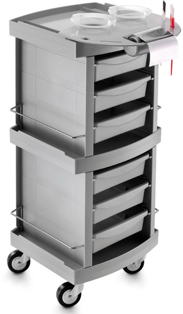 Тележка парикмахерская из прочного пластика на колесах с шестью выдвижными ящиками. Имеет съёмный портативный лоток с двумя отделениями под миски для окрашивания, двумя отверстиями под кисти и держателем для фольги. Также тележка оснащена боковыми ограждениями и отделениями под сопутствующие аксессуары.