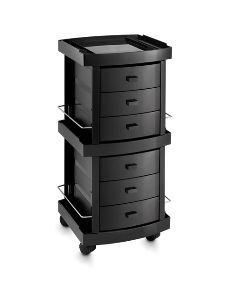 Тележка парикмахерская из прочного пластика закрытого типа на колесах с шестью выдвижными ящиками. Оснащена боковыми ограждениями, а также отделениями под сопутствующие аксессуары.