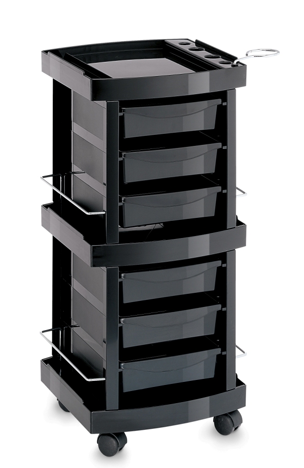 Тележка парикмахерская из прочного пластика на колесах с шестью выдвижными ящиками. Имеет металлический фенодержатель и отверстия под кисти. Также тележка оснащена боковыми ограждениями и отделениями под сопутствующие аксессуары.