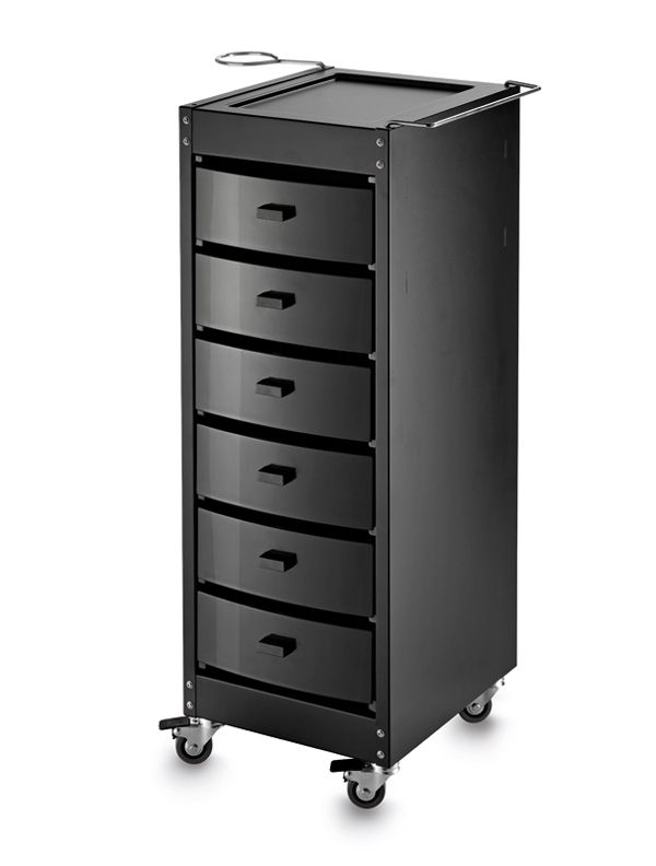 Тележка парикмахерская закрытого типа с шестью выдвижными пластиковыми ящиками. Выполнена из металла, окрашенного в черный матовый цвет. Тележка на колесиках со стопорами, имеет металлический фенодержатель.