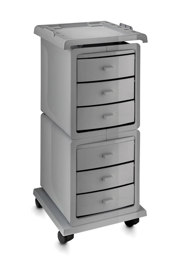 Тележка парикмахерская из прочного пластика закрытого типа на колесах. Имеет боковые отверстия под кисти и сопутствующие аксессуары, а также металлический фенодержатель.