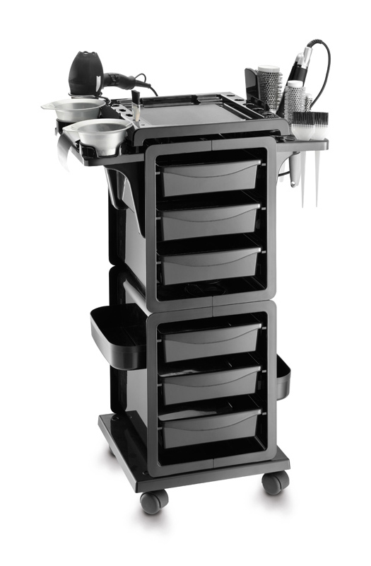 Тележка парикмахерская из прочного пластика на колесах. Оснащена боковыми лотками, которые регулируются по высоте. Также тележка имеет боковые лотки с двумя отделениями под миски для окрашивания, отделение с держателем для фольги, металлический фенодержатель и отделения под кисти и сопутствующие аксессуары.
