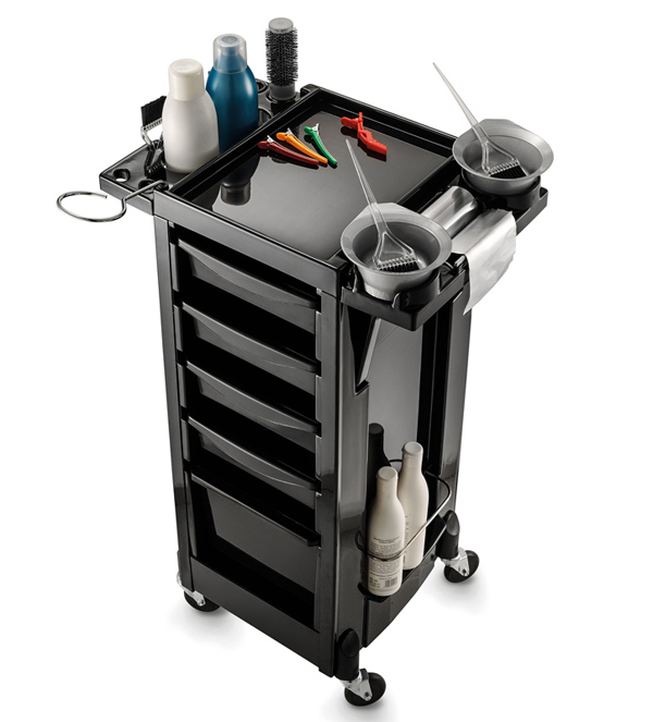 Тележка парикмахерская из прочного пластика. Оснащена прорезиненными колесами для комфортного и бесшумного перемещения, а также боковыми лотками с двумя отделениями под миски для окрашивания, отделением с держателем для фольги, отделением под шампуни и сопутствующие аксессуары, а также металлическим фенодержателем. На боковых частях тележки расположены отсеки для хранения флаконов.