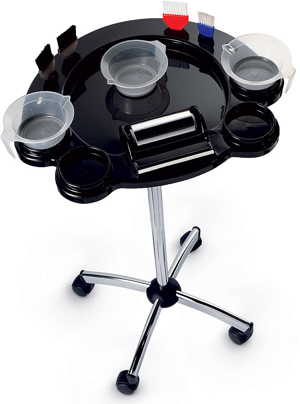 Тележка из пластика на колесах. Имеет 4 боковые и 1 центральное отделения под миски для окрашивания, 1 держатель для бумаги и 4 отверстия под кисти.