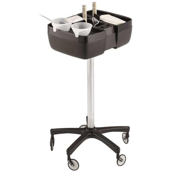 Многофункциональная тележка для окрашивания на колесиках. Тележка выполнена из прочного пластика. Тележка для окрашивания имеет две поворотные рабочие полки которые предоставляют доступ к отделениям для инструментов и аксессуаров. Тележка оснащена специальными углублениями под чаши и аксессуары для окрашивания, основанием на стойке с черным пластиковым пятилучьем.