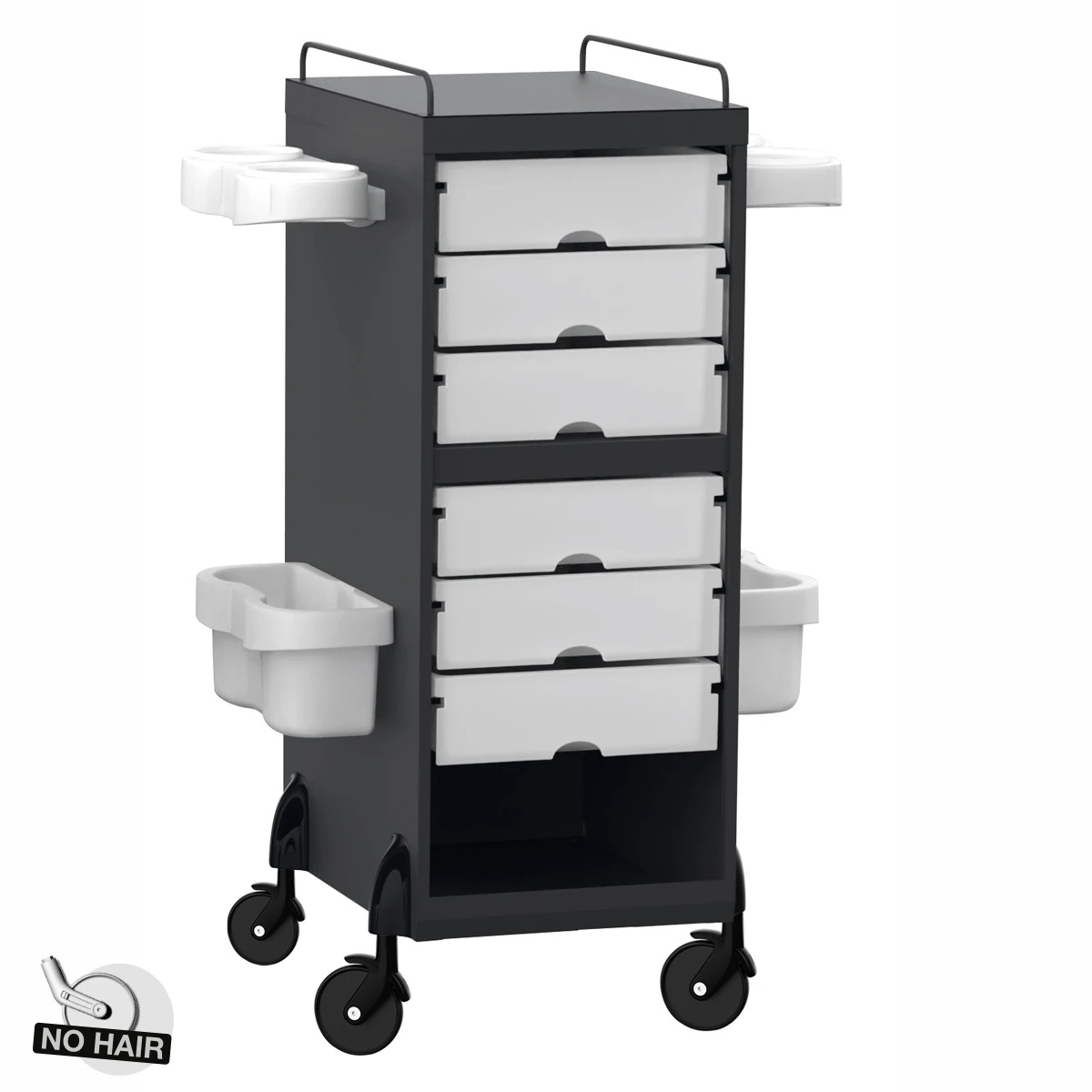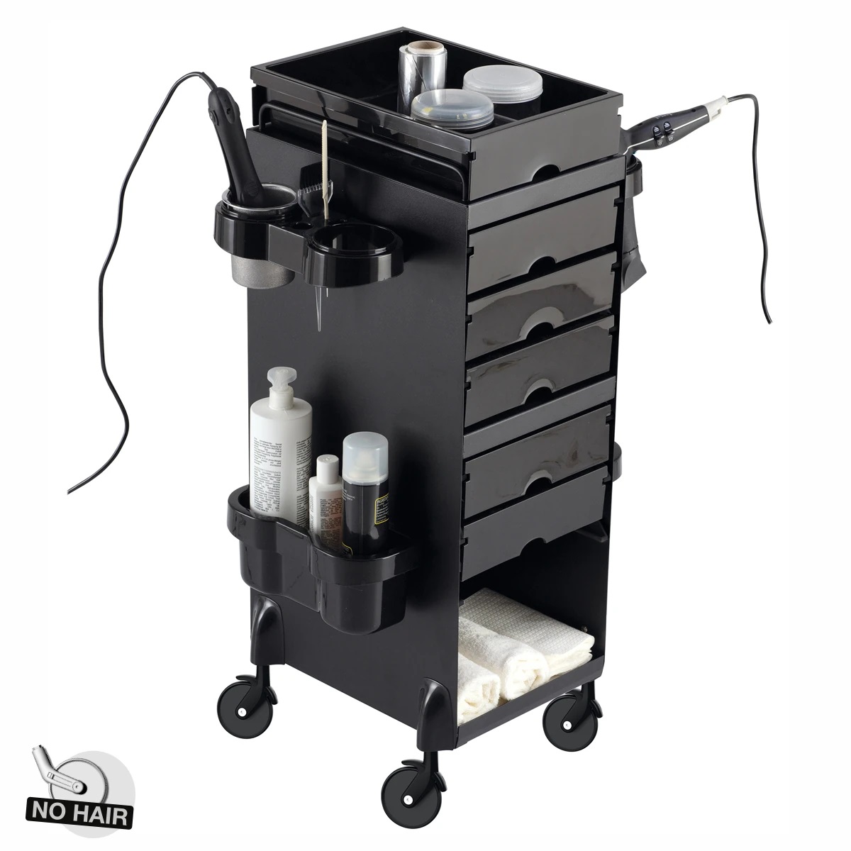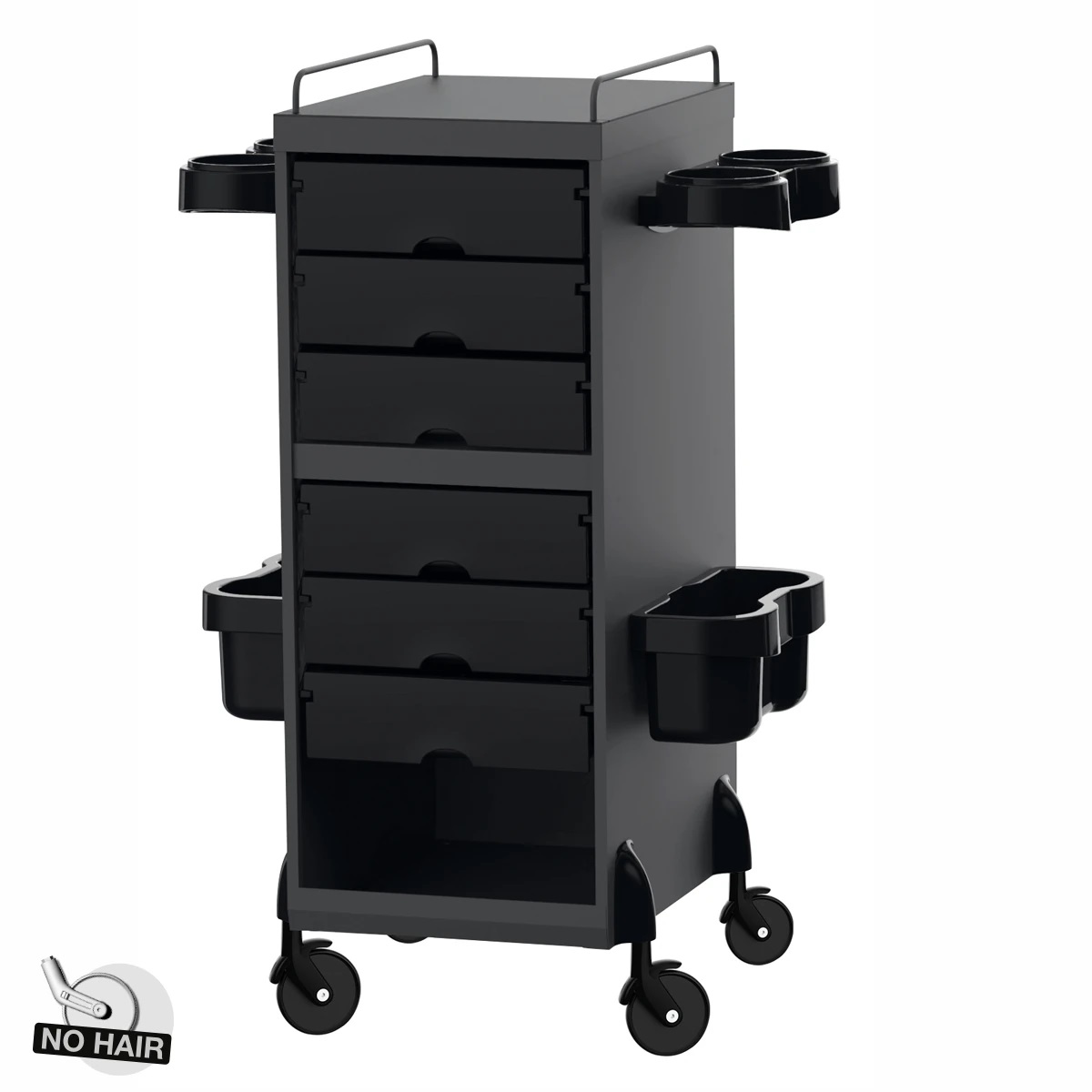 Тележка парикмахерская на бесшумных колесиках "NO HAIR". Тележка выполнена из металла. Тележка оснащена шестью выдвижными ящиками, съемными боковыми полками, предназначеными для размещения фена и нишей для хранения инструментов.