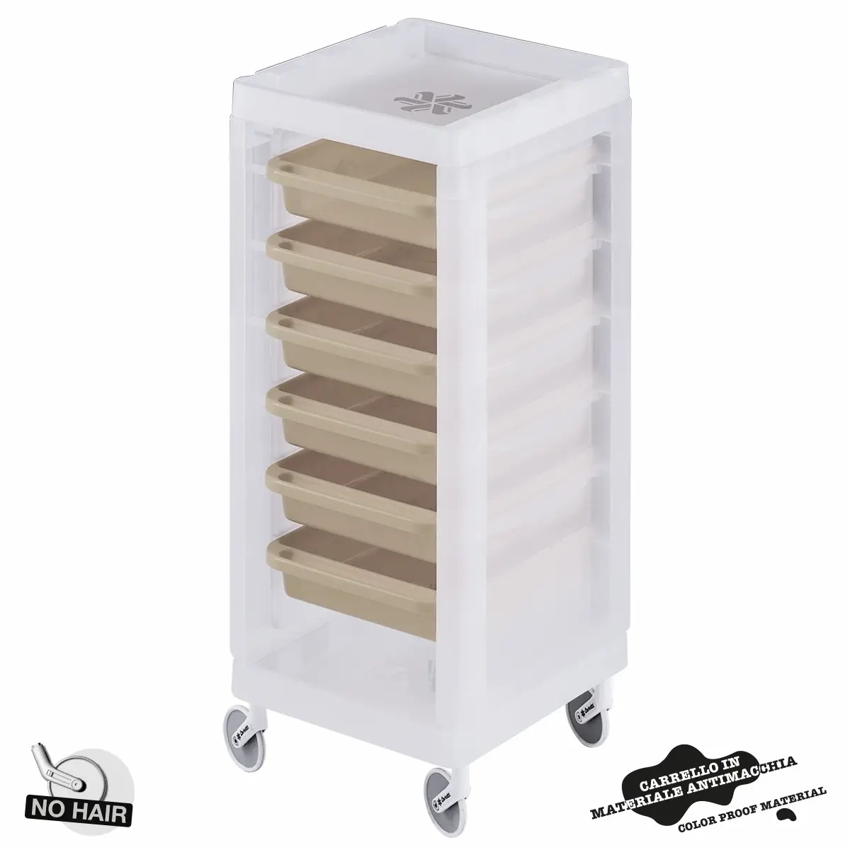 Тележка парикмахерская полузакрытого типа на колесиках. Выполнена из прочного прозрачного пластика, имеет 6 выдвижных ящиков и возможность установки их сбоку тележки.