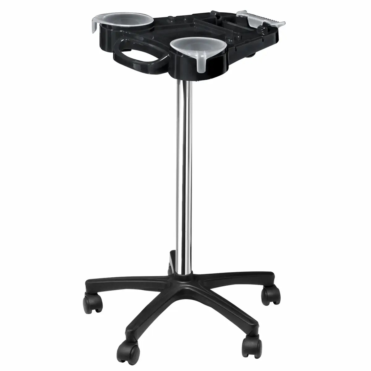 Тележка для окрашивания на колесиках. Тележка выполнена из прочного пластика. Тележка оснащена специальными углублениями под чаши и аксессуары для окрашивания, основанием на стойке с черным пластиковым пятилучьем.