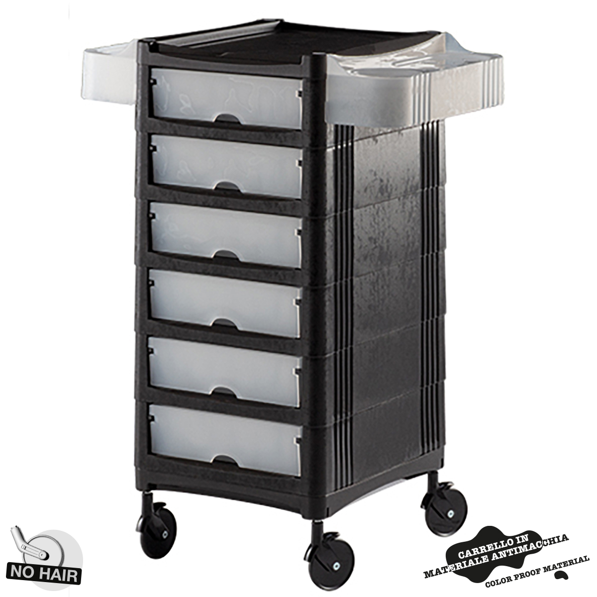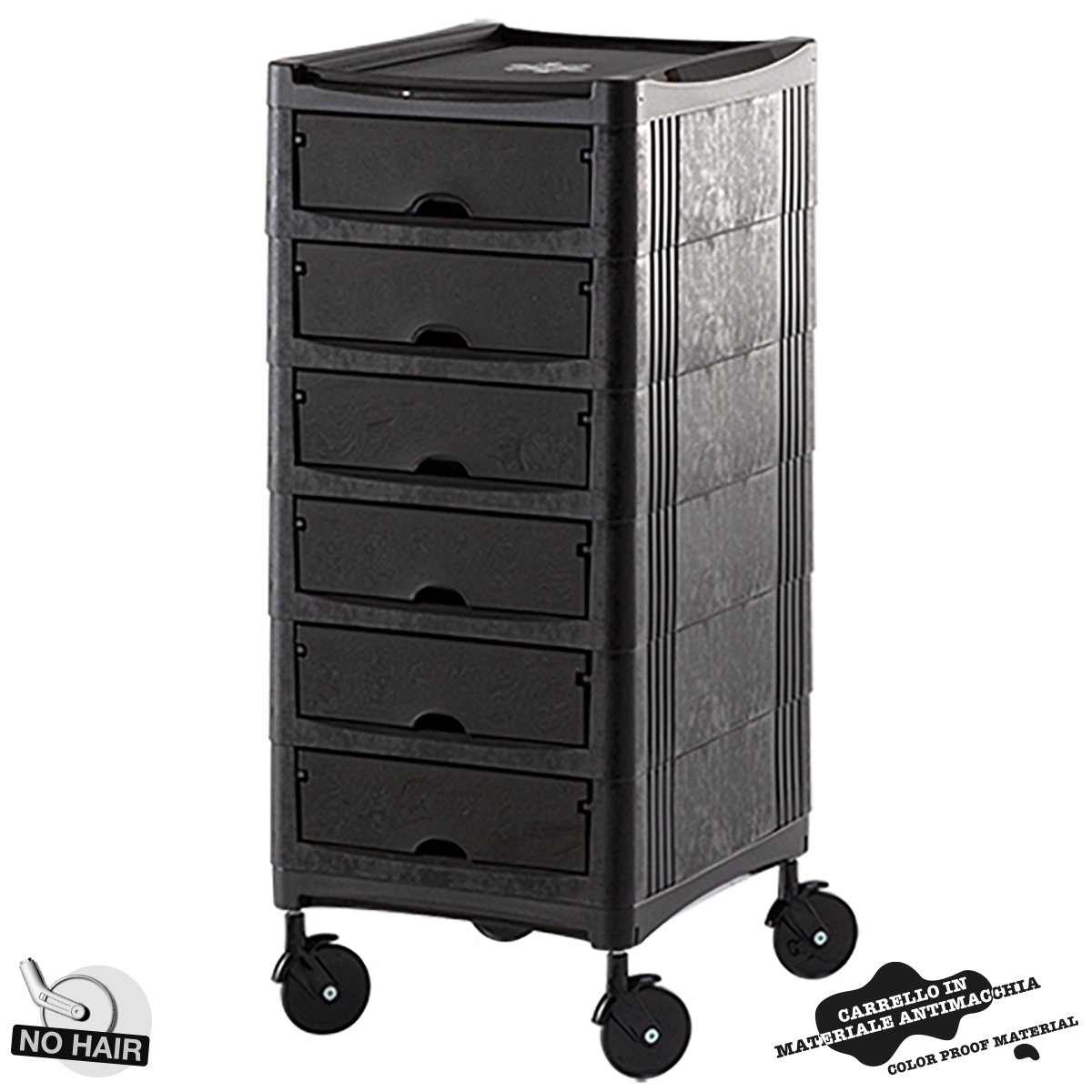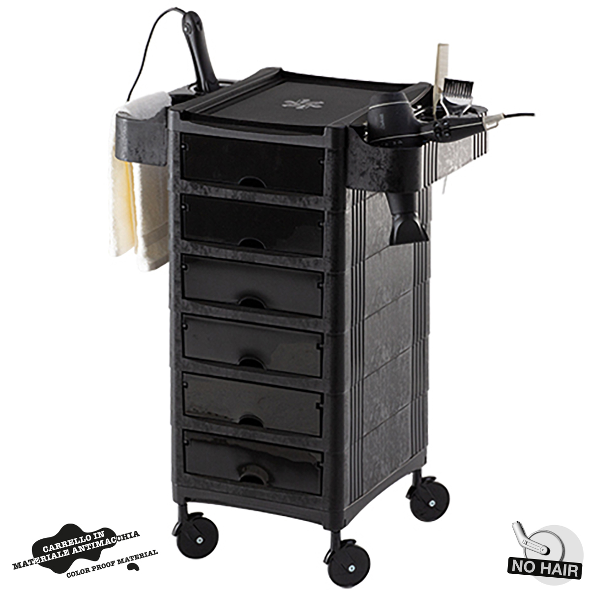 Тележка парикмахерская на бесшумных колесиках "NO HAIR". Тележка выполнена из прочного пластика черного цвета. Тележка оснащена шестью выдвижными ящиками, съемными боковыми полками, предназначеными для размещения фена и хранения инструментов.