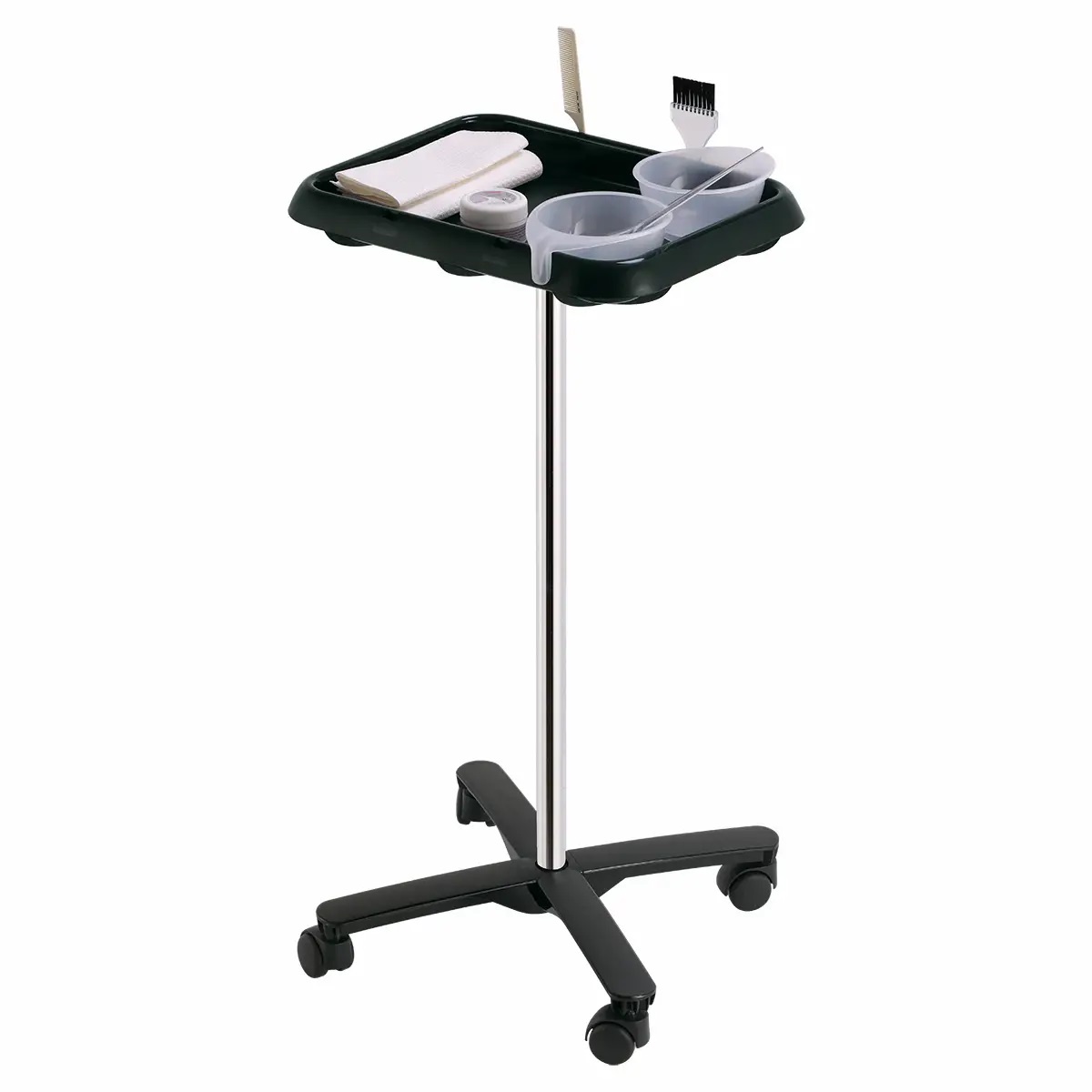 Тележка для окрашивания на колесиках. Тележка выполнена из прочного пластика. Тележка оснащена специальным углублением под чаши и аксессуары для окрашивания. Основание на стойке с черным пластиковым пятилучьем.