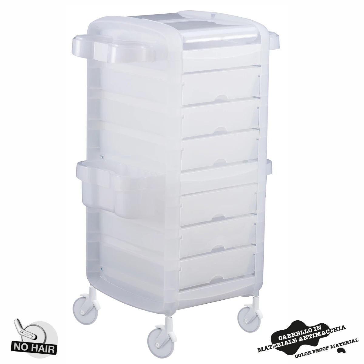 Тележка парикмахерская на бесшумных колесиках "NO HAIR". Тележка выполнена из прочного пластика. Тележка оснащена шестью выдвижными ящиками, съемными боковыми полками, предназначеными для хранения инструментов, открываемыми верхними дверцами для создания функциональной столешницы.