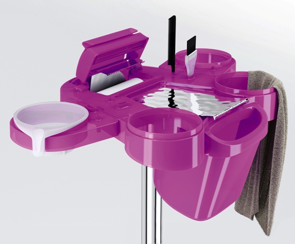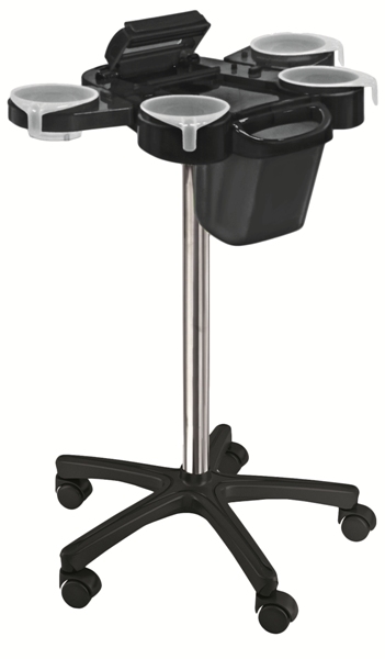 Тележка для окрашивания на колесиках. Тележка выполнена из прочного пластика. Тележка оснащена специальными углублениями под чаши и аксессуары для окрашивания, основанием на стойке с черным пластиковым пятилучьем.