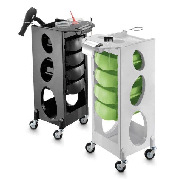 Тележка парикмахерская из прочного пластика с четырьмя ящиками и отделением под сумки. Оснащена прорезиненными колесами для комфортного и бесшумного перемещения, металлическим фенодержателем и боковыми отверстиями для кистей. Имеет съёмный портативный лоток с двумя отделениями под миски для окрашивания и держатель для фольги. Боковые стенки тележки имеют декоративные отверстия.