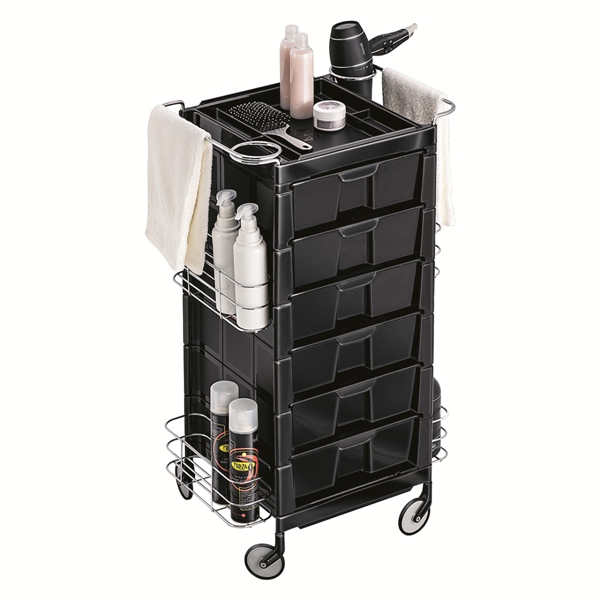 Тележка парикмахерская закрытого типа на бесшумных колесиках "NO HAIR". Тележка выполнена из прочного пластика. Тележка оснащена шестью выдвижными ящиками и съемными боковыми полками, предназначеными для хранения инструментов.