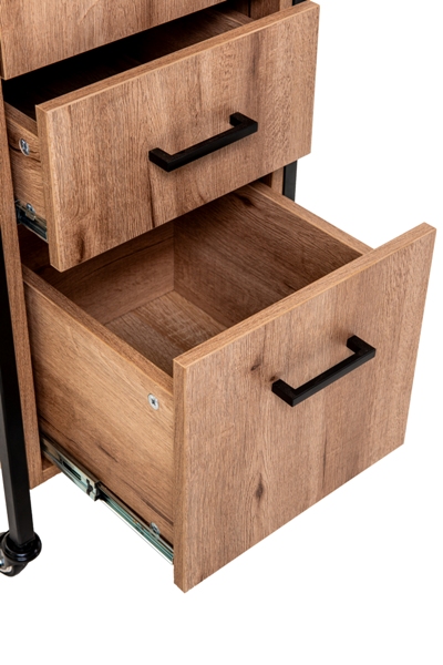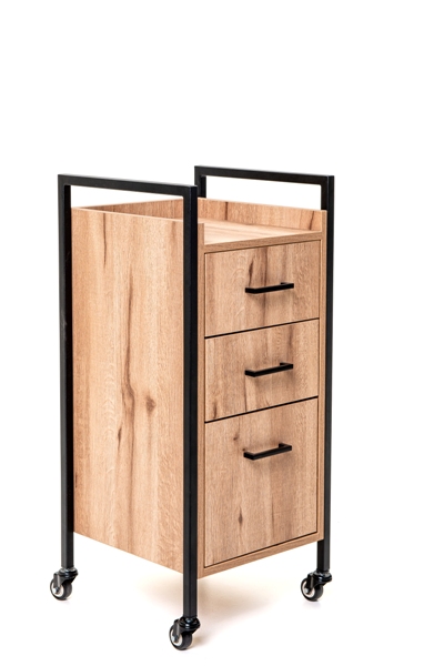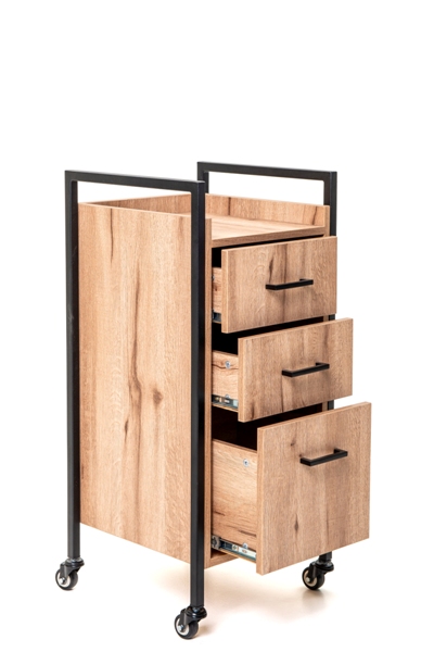Тележка ТЭКТУМ 3 — это модель тележки из коллекции ТЭКТУМ, предназначенная для удобного хранения инструментов и аксессуаров парикмахера. Она оснащена тремя просторными выдвижными ящиками, которые помогут поддерживать порядок в рабочем пространстве. Каркас тележки выполнен из металла с порошковым покрытием, что обеспечивает долговечность и стойкость к повреждениям. Корпус и ящики изготовлены из ЛДСП, что придает тележке современный и стильный вид. Особенности модели — это качественные шариковые направляющие с полным выдвижением для каждого ящика, что значительно облегчает доступ к необходимым аксессуарам. Также тележка оснащена бесшумными колесными опорами, обеспечивающими отличную маневренность и легкость в передвижении по салону. Эргономичные рукоятки добавляют комфорта при перемещении тележки. В отличие от более бюджетных моделей, тележка ТЭКТУМ 3 отличается высоким качеством материалов и продуманной конструкцией, что делает ее надежным помощником в процессе работы. Тележка ТЭКТУМ 3 — идеальное решение для профессионалов, ценящих удобство, качество и стиль.