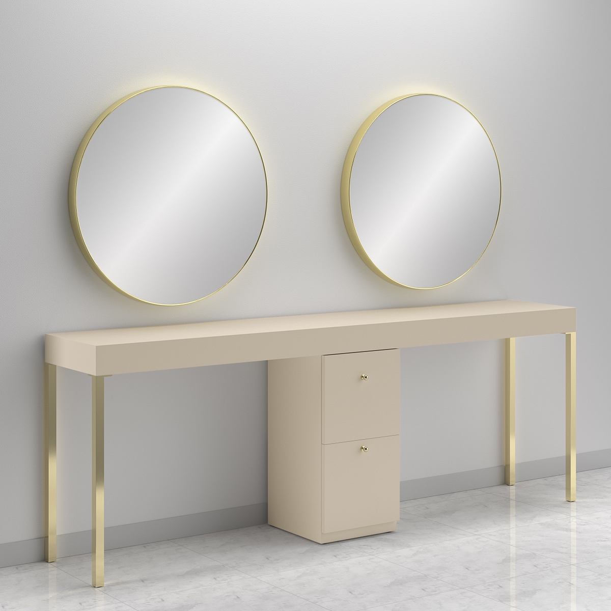 Напольная тумба для рабочих туалетов CONSOLLE CARRE и CONSOLLE RONDE. Тумба оснащена розетками и двумя выдвижными ящиками. Тумба выполнена в ламинате.
