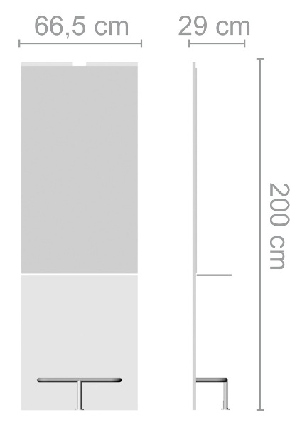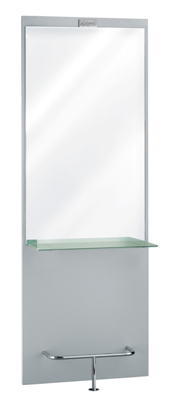 Зеркало парикмахерское одностороннее прямоугольной формы, крепление к стене. Каркас выполнен из ламината серого или чёрного цвета, плоская стеклянная столешница. Металлическая подставка под ноги.