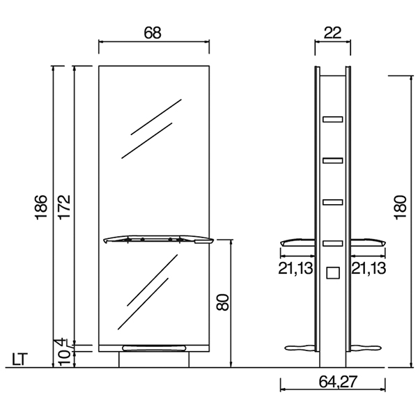 Двусторонний рабочий туалет на два рабочих места. Рабочий туалет оснащен боковыми полками для хранения, алюминиевыми столешницами оригинальной формы с отверстиями для фена и подставками под ноги. Крепление к полу.