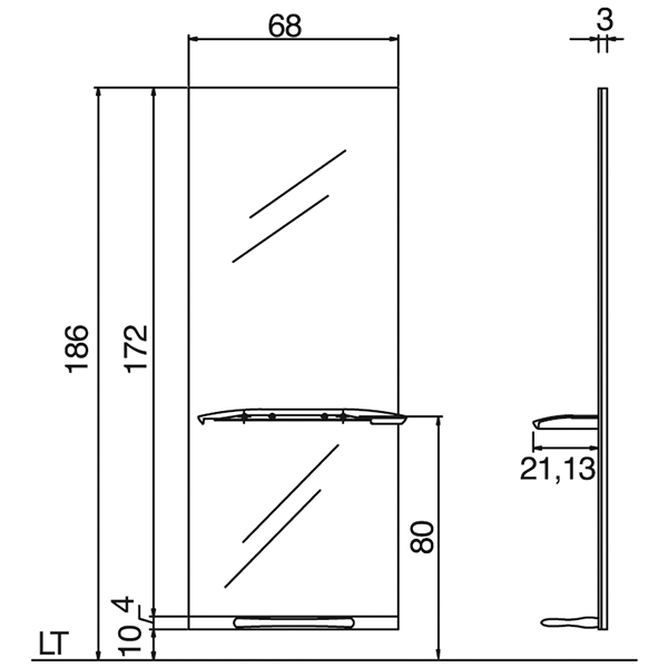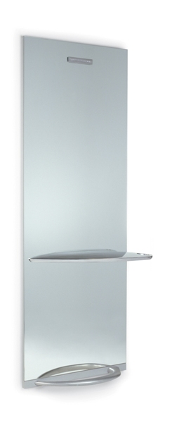 Зеркало парикмахерское прямоугольной формы. Зеркало оснащено алюминиевой столешницей оригинальной формы с отверстием для фена и подставкой под ноги. Крепление к стене.