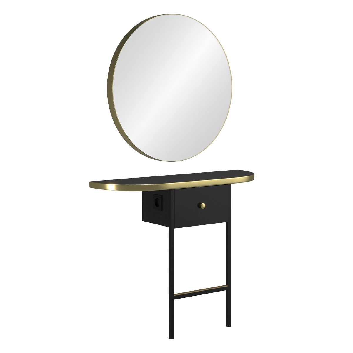 Рабочий туалет на одно рабочее место. Рабочий туалет оснащен зеркалом округлой формы и рабочим столиком в черном цвете. Рабочий стол оснащен розетками и выдвижным ящиком. Окантовка зеркал и столешницы выполнена в глянцевом черном или золотом цвете. Крепление к стене.