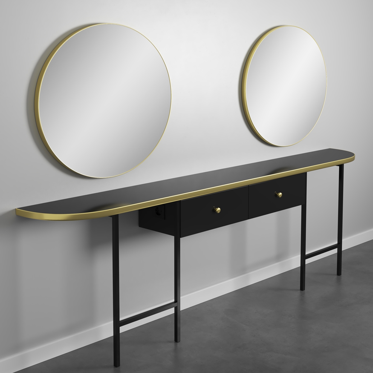 Рабочий туалет на два места. Рабочий туалет оснащен зеркалами круглой формы и рабочим столиком в черном цвете. Рабочий стол оснащен розетками и двумя выдвижными ящиками. Окантовка зеркал и столешницы выполнена в глянцевом черном или золотом цвете. Крепление к стене.