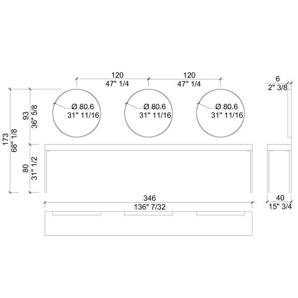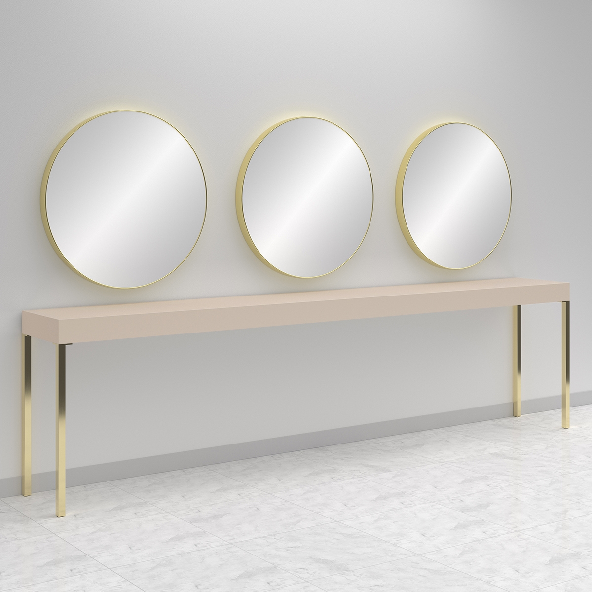 Рабочий туалет на три рабочих места. Рабочий туалет оснащен зеркалами округлой формы и рабочим столиком. Рабочий стол выполнен в ламинате. Окантовка зеркал и ножки рабочего стола выполнены в черном или золотом цвете. Крепление к стене.