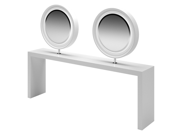 Двусторонний рабочий туалет на четыре рабочих места. Рабочий туалет выполнен в ламинате белого цвета. Рабочий туалет оснащен зеркалами округлой формы в декоративной раме.