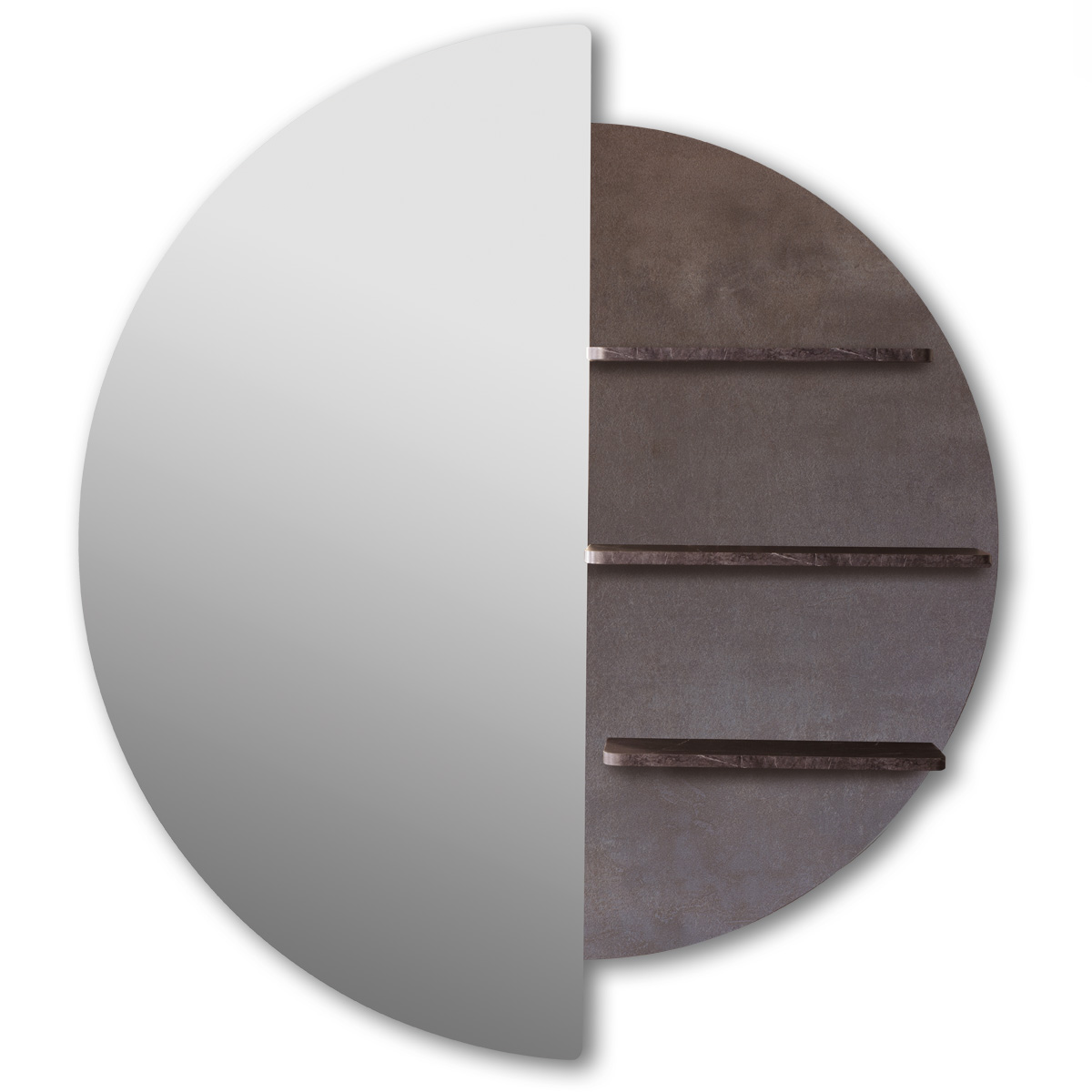 Зеркало парикмахерское одностороннее оригинальной формы. Зеркало оснащено тремя полками для хранения инструментов. Рабочий туалет выполнен в ламинате. Крепление к стене.